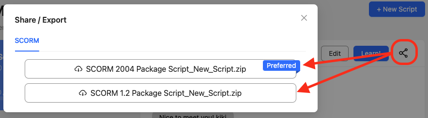 Go to the activity you want to export, find the Share icon, then choose which SCORM version you want to use.